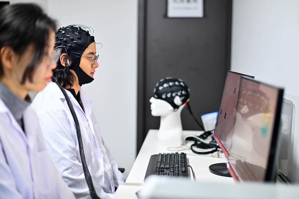 2026年2月27日,在位于天津滨海高新区的中电云脑(天津)科技有限公司,工作人员进行脑机接口技术测试。新华社记者赵子硕摄