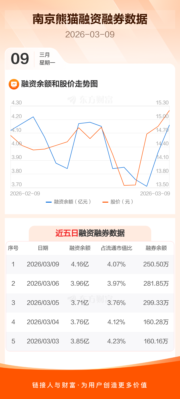 交易所最新数据显示,南京熊猫于2026年3月9日获融资买入1.02亿元,融资偿还8193.12万元,当日融资净买入2021.19万元。目前,该股融资余额4.16亿,占流通市值比例为4.07%。