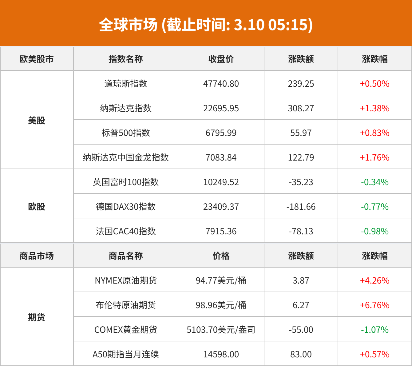 美股市场:美股三大指数03月09日收盘全线上涨。截至收盘,道琼斯工业平均指数比前一交易日上涨239.25点,收于47740.8点,涨幅为0.5%;标准普尔500种股票指数上涨55.97点,收于6795.99点,涨幅为0.83%;纳斯达克综合指数上涨308.27点,收于22695.95点,涨幅为1.38%。据央视新闻,美国总统特朗普表示,美国对伊朗的战争可能很快就会结束。
