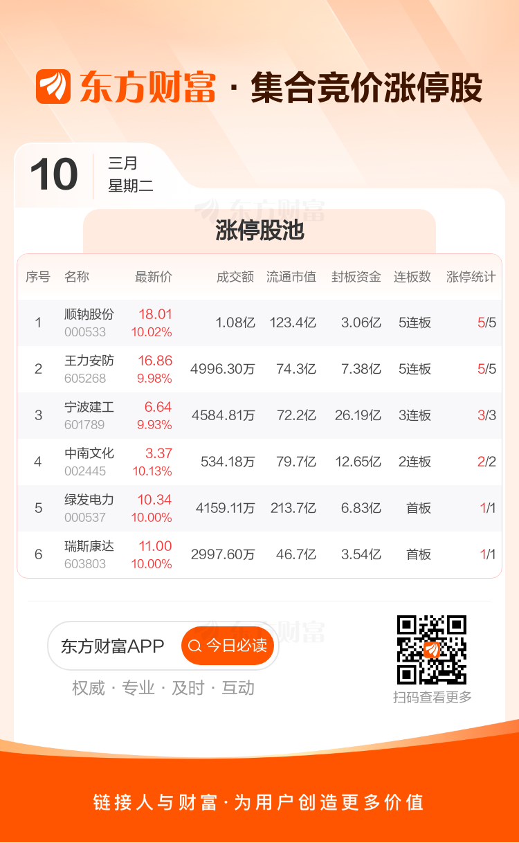3月10日集合竞价:顺钠股份、王力安防5连板