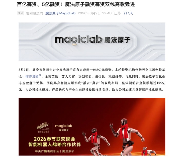 3月9日,具身智能领先企业魔法原子宣布完成新一轮5亿元融资。本轮投资机构包括天空工场创投基金、拓普集团、金雨茂物、苏大天宫、杰创智能、爱仕达、梁创投等。与此同时,魔法原子百亿生态基金落子无锡,围绕具身智能应用形成“融资+募资”的双线布局,整体撬动资金规模超过105亿元,为公司技术研发、产品迭代与产业生态建设提供持续支撑,助力公司加速具身智能产业化落地。