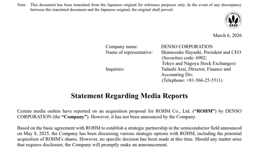 日本汽车零部件巨头电装公司(DENSO)发布公告称,部分媒体报道了电装公司拟收购罗姆半导体有限公司(ROHM)的提议。但公司尚未就此发布公告。基于2025年5月8日公布的,双方在半导体领域建立战略合作伙伴关系的基本协议,电装公司一直在与罗姆探讨各种战略选择,包括可能收购罗姆的股份。不过,目前尚未做出任何具体决定。若出现需要披露的事项,本公司将及时发布公告。2025年双方的协议内容主要为,电装通过注资持有罗姆约5%的股份,旨在电动汽车(EV)功率转换技术领域展开深度协作。
