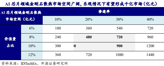 而开源证券通过价值量占比及渗透率两个维度测算,假设2030年全球AI芯片市场规模3万亿人民币(依据IDTechEx报告给出2030年AI芯片市场规模约4530亿美元换算而来),假设金刚石散热在AI芯片环节价值量占比分别为6%-12%,假设金刚石散热方案在AI芯片中渗透率10%-40%,对2030年金刚石散热市场规模进行敏感性测算。中性情景下,2030年AI芯片领域金刚石散热市场规模有望达480-900亿元。最乐观可达1440亿元。