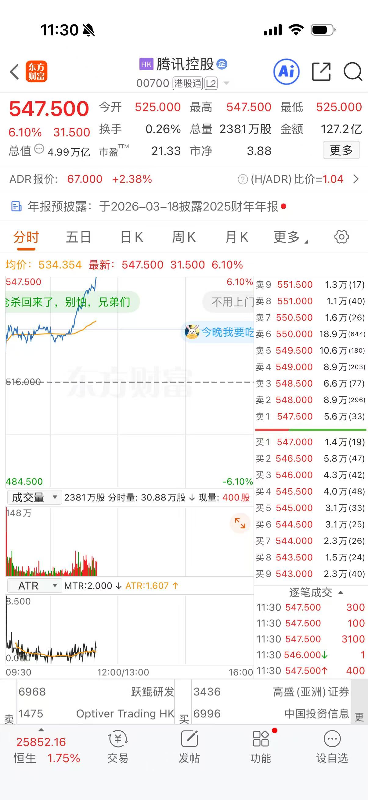 上证报中国证券网讯(记者何治民)3月10日,腾讯控股盘中拉升,截至11时30分,腾讯控股涨6.10%,报547.50港元/股,总市值逼近5万亿港元。