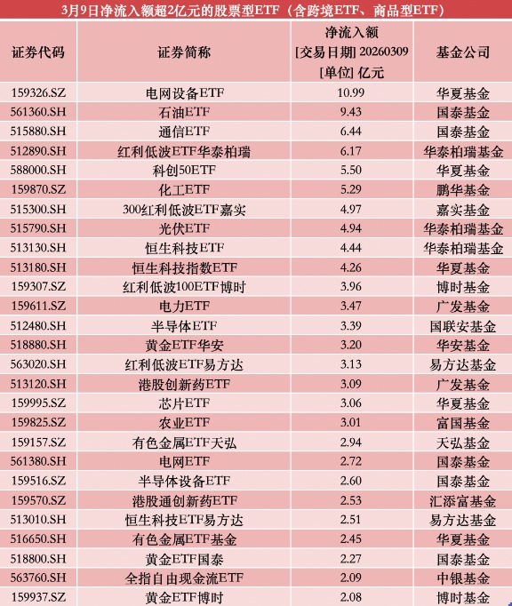 澎湃新闻记者根据Wind数据统计发现,3月9日,全市场1365只可统计的股票型ETF(含跨境ETF、商品型ETF)单日累计净流入达126.75亿元。从资金具体流向来看,电网、石油、通信、红利、科创等主题ETF产品受到资金青睐,吸金效应显著。