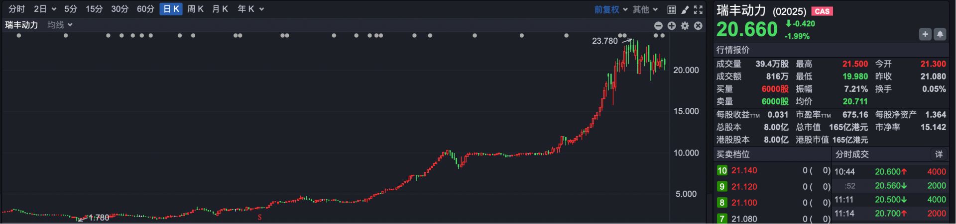 2024年9月,瑞丰动力(HK02025)股价一度跌到不足1港元,而到今年初,最高已经涨到23.78港元,累计最大涨幅超过20倍。