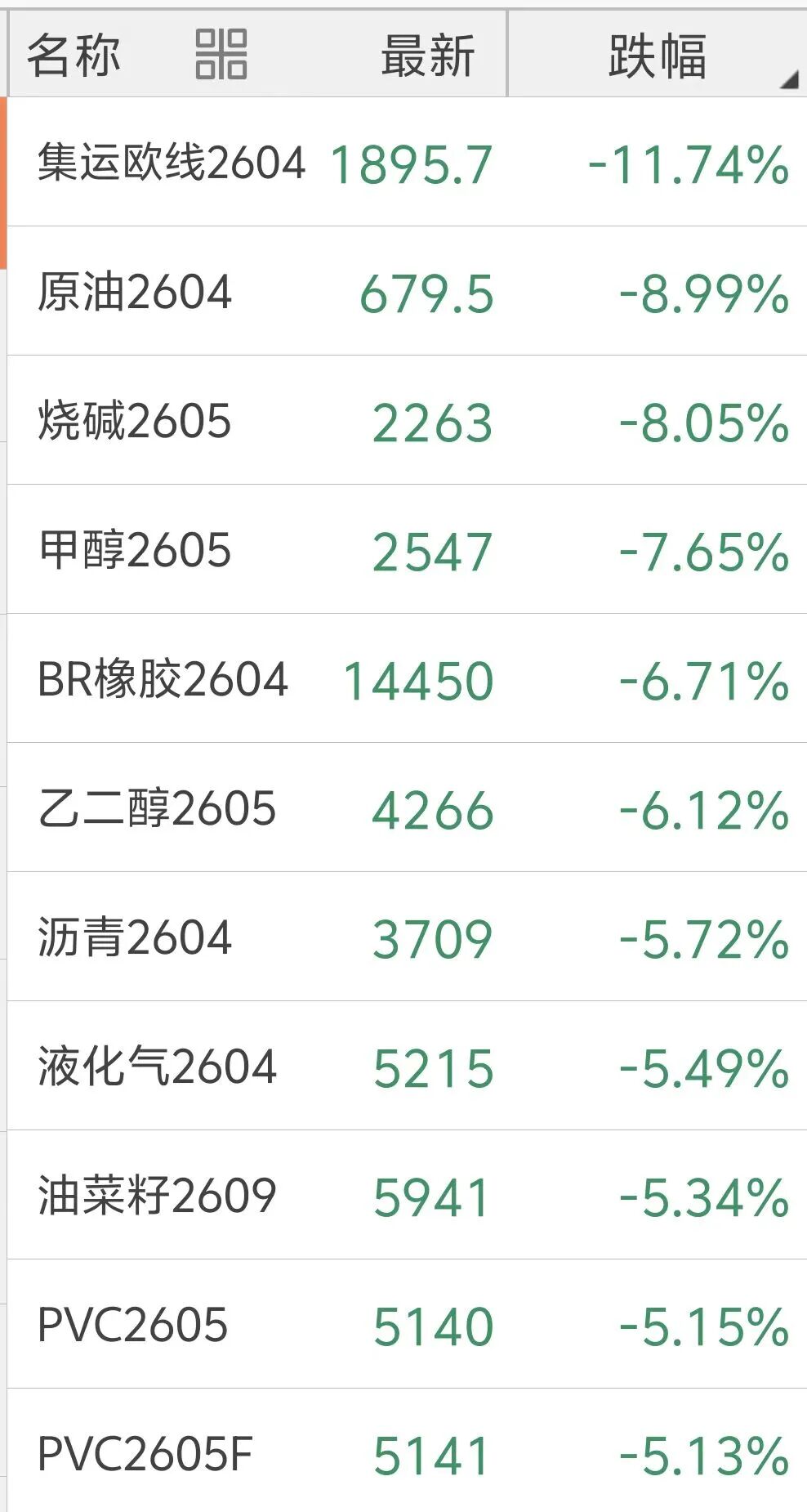 今日早盘,国内期货市场多数下跌,航运及能化品种跌幅居前。截至上午收盘,集运指数(欧线)期货主力合约跌超11%,原油、烧碱期货主力合约跌超8%,甲醇期货主力合约跌超7%,丁二烯橡胶、乙二醇期货主力合约跌超6%。