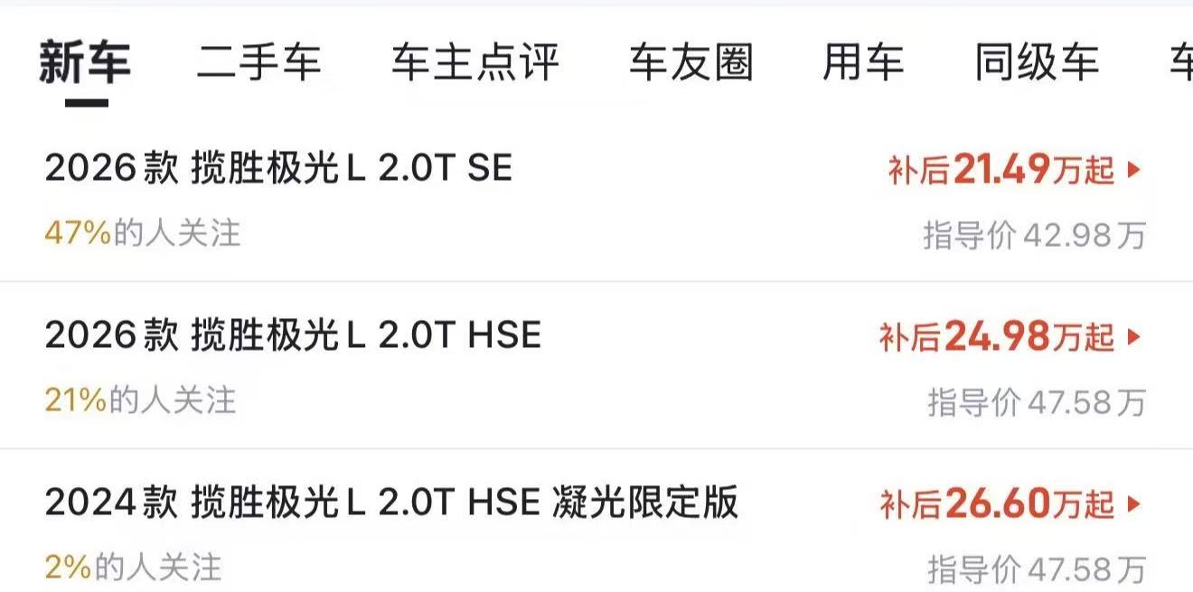 此后常年,经销商大幅折扣清库存,市场上甚至流传“七折虎六折豹”的说法。如今路虎揽胜极光、捷豹XFL等畅销车型更是普遍低于指导价五折。