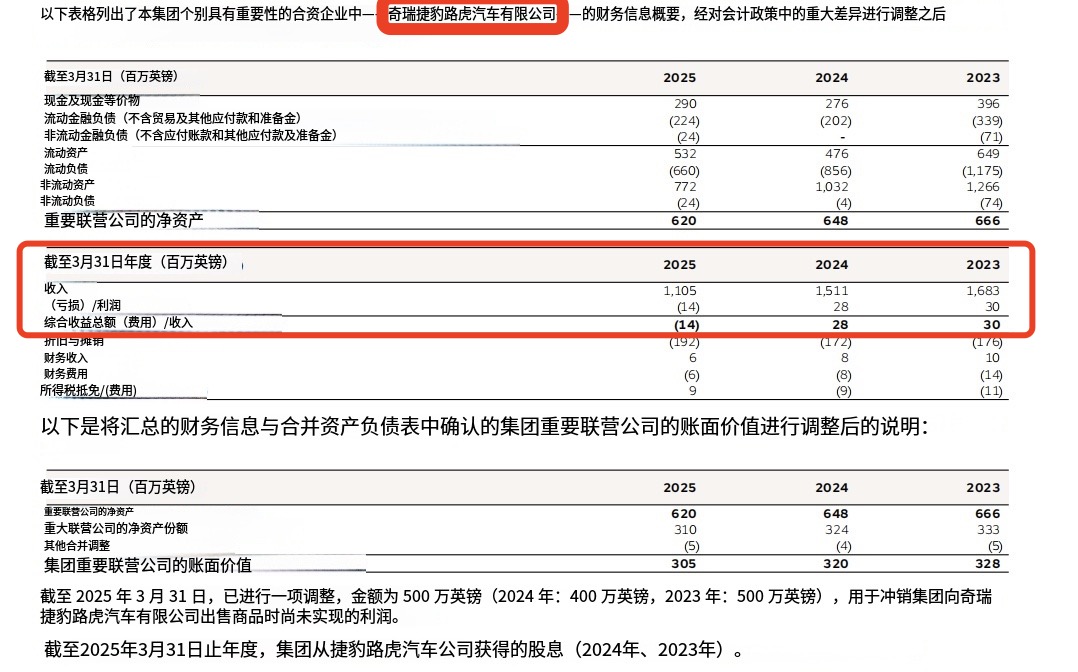 更为严峻的是,2025财年,奇瑞捷豹路虎首次陷入亏损。2025财年显示,奇瑞捷豹路虎亏损1400万英镑(折合人民币1.3亿元)。