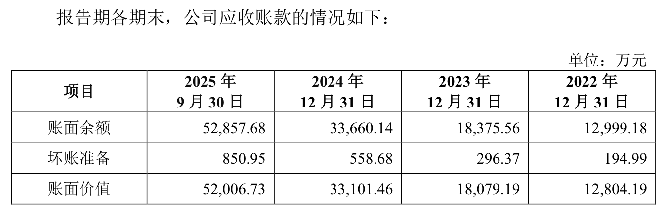 2022年至2025年前三季度,鑫华科技应收账款账面余额分别为1.3亿元、1.84亿元、3.37亿元、5.29亿元,应收账款余额占当期营业收入比例分别为10.20%,19.42%、30.33%和29.68%,占比节节攀升。公司称,随着副产品太阳能级多晶硅行情由暖转冷,从2023年下半年以来,客户的回款周期明显延长。报告期内对应的应收账款周转率趋势保持一致,分别为12.39次、6.03次、4.26次、4.12次。