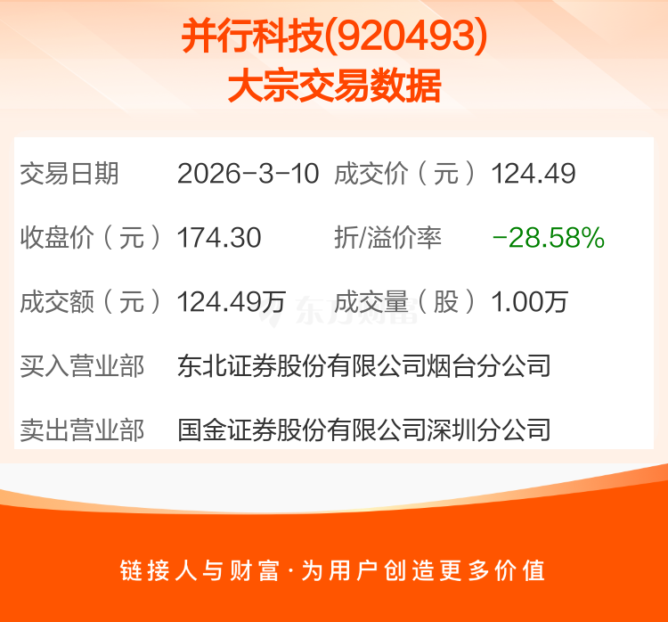 2026年3月10日,并行科技发生1笔大宗交易,共成交1.00万股,成交金额124.49万元,占其流通市值比例为0.02%。