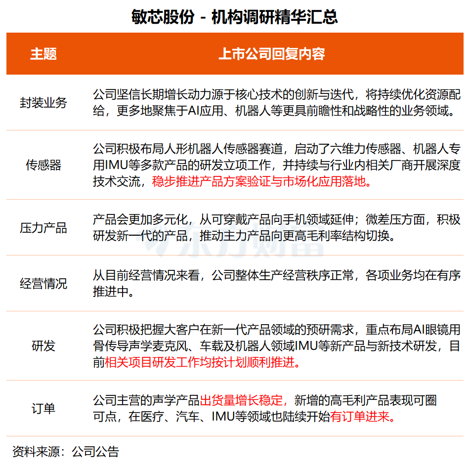 在调研中,敏芯股份表示,公司积极布局人形机器人传感器赛道,启动了六维力传感器、机器人专用IMU、手套型压力与温度传感器等多款产品的研发立项工作,并持续与行业内相关厂商开展深度技术交流,稳步推进产品方案验证与市场化应用落地。