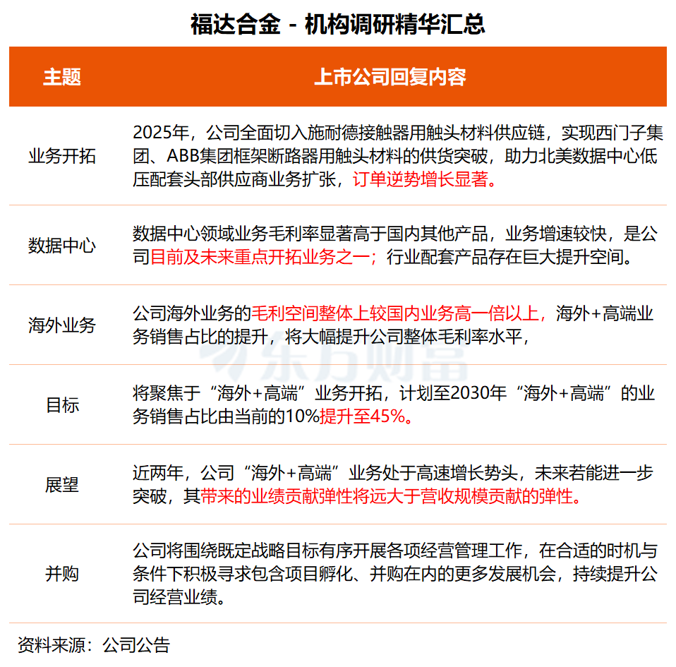 在调研中,福达合金表示,公司海外业务的毛利空间整体上较国内业务高一倍以上,海外+高端业务销售占比的提升将大幅提升公司整体毛利率水平,未来公司业务的增长也将聚焦于“海外+高端”的业务开拓,计划至2030年“海外+高端”的业务销售占比由当前的10%提升至45%。