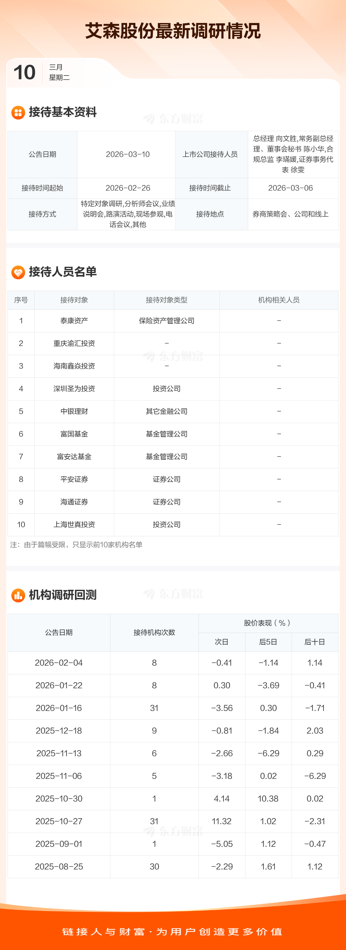 艾森股份3月10日公告称,2月26日至3月6日接待泰康资产等41家机构调研。接待人员包括总经理 向文胜,常务副总经理、董事会秘书 陈小华,合规总监 李璊媛,证券事务代表 徐雯。