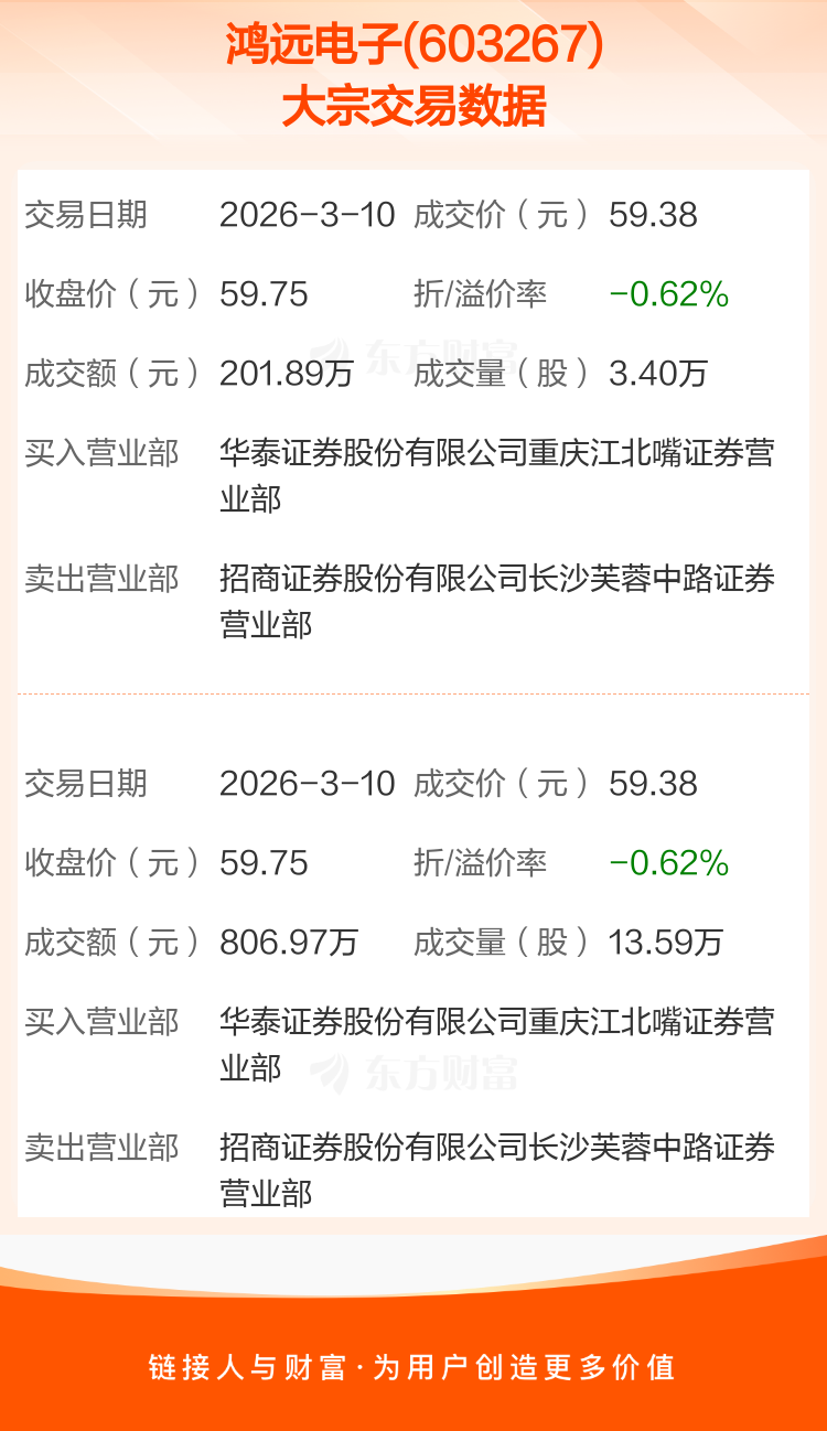 2026年3月10日,鸿远电子发生2笔大宗交易,共成交16.99万股,成交金额1008.86万元,占其流通市值比例为0.07%。