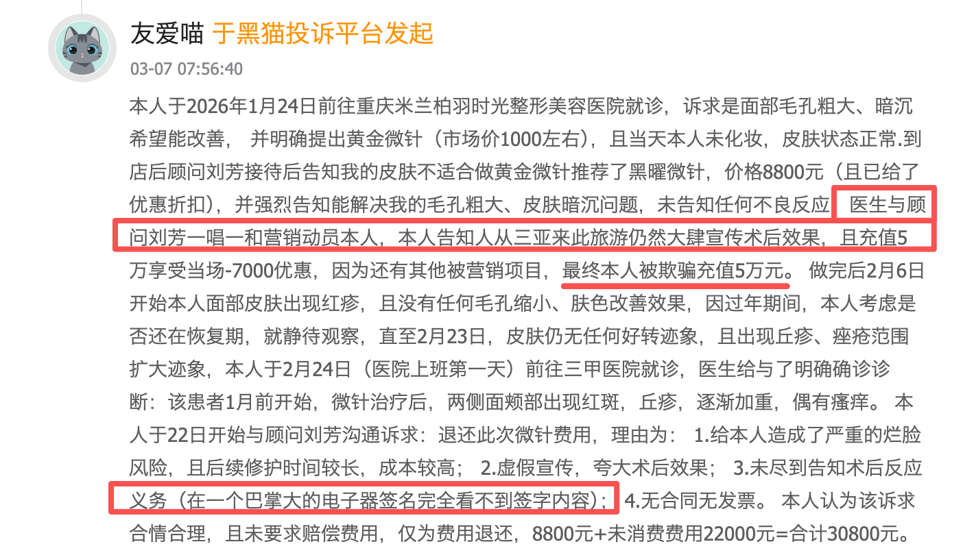除了医疗安全事故,米兰柏羽在终端营销上的合规性同样面临拷问。3月7日,针对重庆米兰柏羽时光整形美容医院的一起投诉显示,消费者本欲进行常规的黄金微针项目,却在院方咨询顾问的诱导下,不仅接受了未被告知不良反应的“黑曜微针”高价项目,还被诱导充值高达5万元。术后,该消费者面部出现严重红斑与丘疹,且机构未能提供正规合同与发票,涉嫌虚假宣传与违规操作。紧接着在3月8日,深圳米兰柏羽又被指控隆鼻手术失败,且在诱导消费者充值1万元后,拒绝退还余额并单方面限制线上消费,被指存在“霸王条款”。