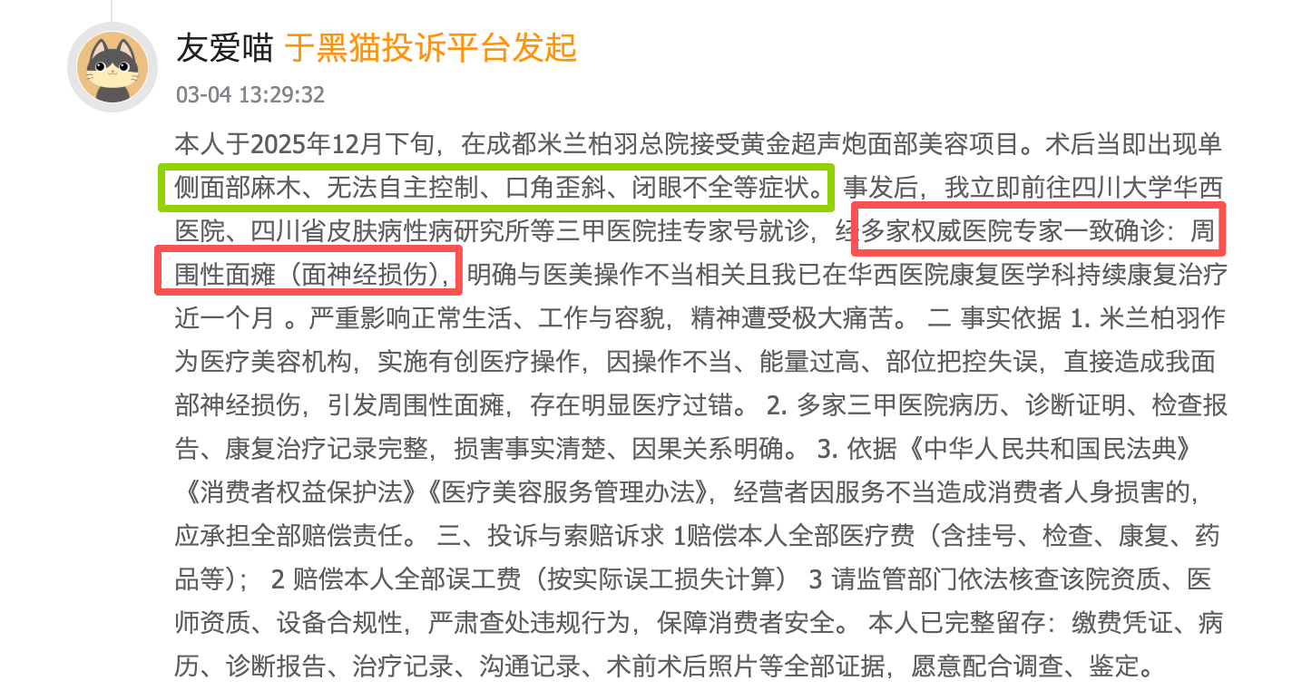 2026年3月初,黑猫投诉平台密集出现了多起针对米兰柏羽旗下机构的严重客诉。3月4日,有消费者实名投诉称,在成都米兰柏羽总院接受“黄金超声炮”面部美容项目后,当即出现单侧面部麻木、口角歪斜等症状,后经华西医院等三甲医院确诊为由医疗操作不当引发的周围性面瘫(面神经损伤)。该消费者不仅要求索赔,更明确呼吁监管部门依法核查该院资质与设备合规性。