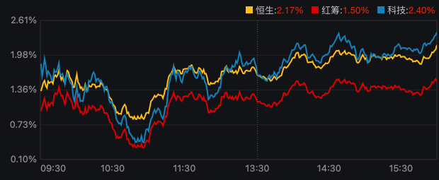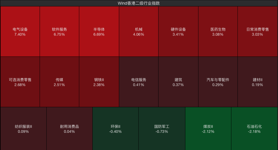 分板块来看,根据Wind香港二级行业指数,涨幅前三的板块分别为香港电气设备(+7.40%)、香港软件服务(+6.75%)香港半导体(+6.69%)。