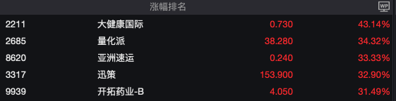 从个股表现来看,涨幅前三中,大健康国际(2211.HK) 以43.14%的涨幅位居榜首;金融科技公司量化派(2685.HK)上涨34.32%。OpenClaw概念股迅策(3317.HK) 延续昨日强势,今日大涨32.90%。