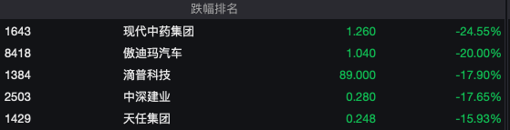 跌幅靠前的个股中,现代中药集团(1643.HK)下跌24.55%,傲迪马汽车(8418.HK)下跌20%,滴普科技(1384.HK)下跌17.90%,中深建业(2503.HK)下跌17.65%。