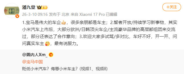 宝马销售被指直播拉踩小米汽车,称“180天造的车不敢开”,小米高管回应