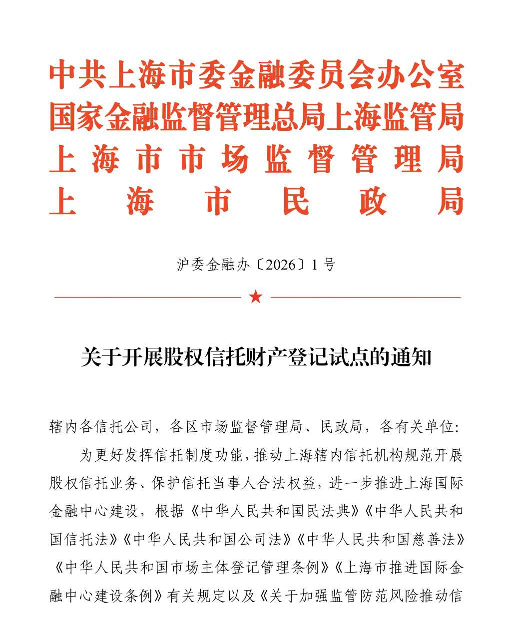 据上海金融官微,3月5日,中共上海市委金融委员会办公室、国家金融监督管理总局上海监管局、上海市市场监督管理局、上海市民政局联合印发了《关于开展股权信托财产登记试点的通知》(沪委金融办〔2026〕1号,以下简称《通知》)。