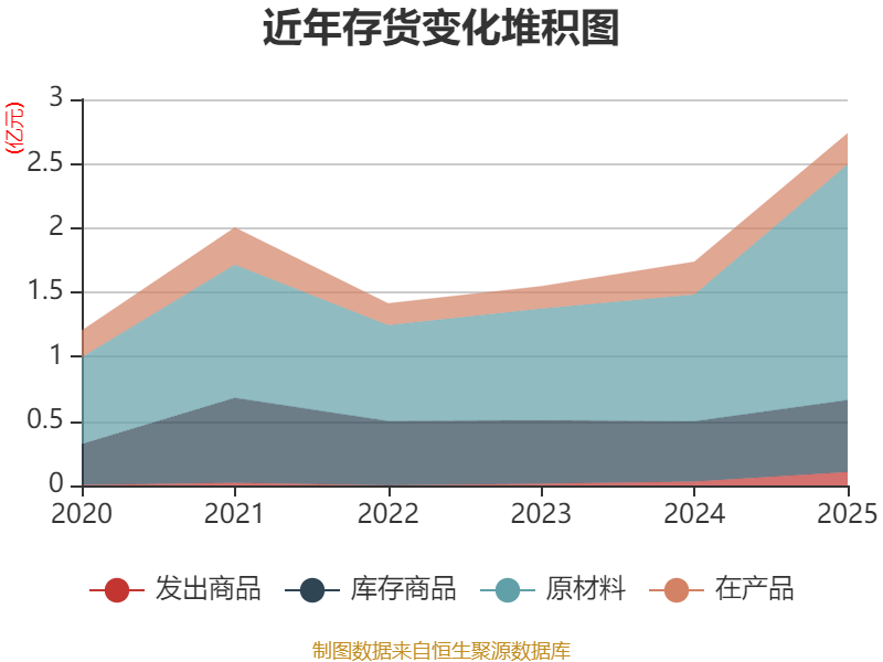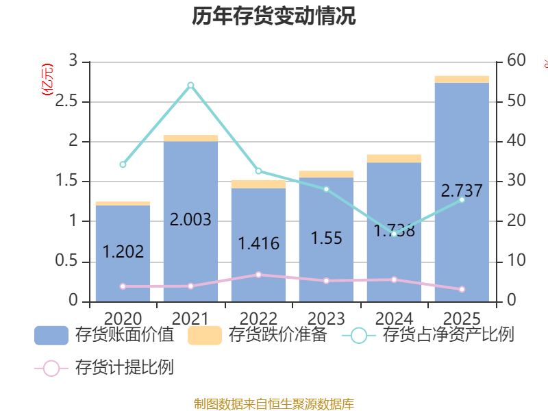从存货变动来看,截至2025年末,公司存货账面价值为2.74亿元,占净资产的25.43%,较上年末增加9986.66万元。其中,存货跌价准备为849.93万元,计提比例为3.01%。