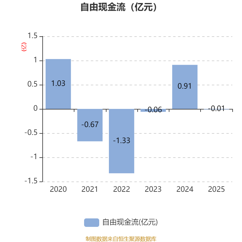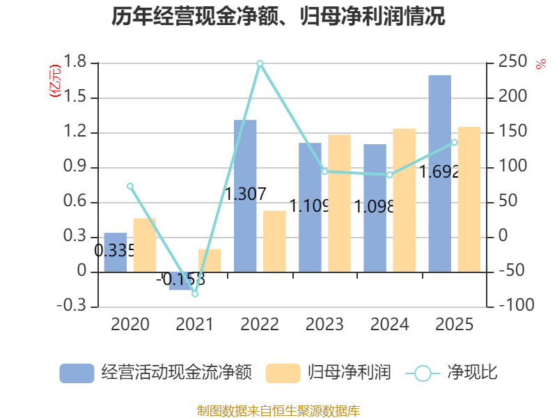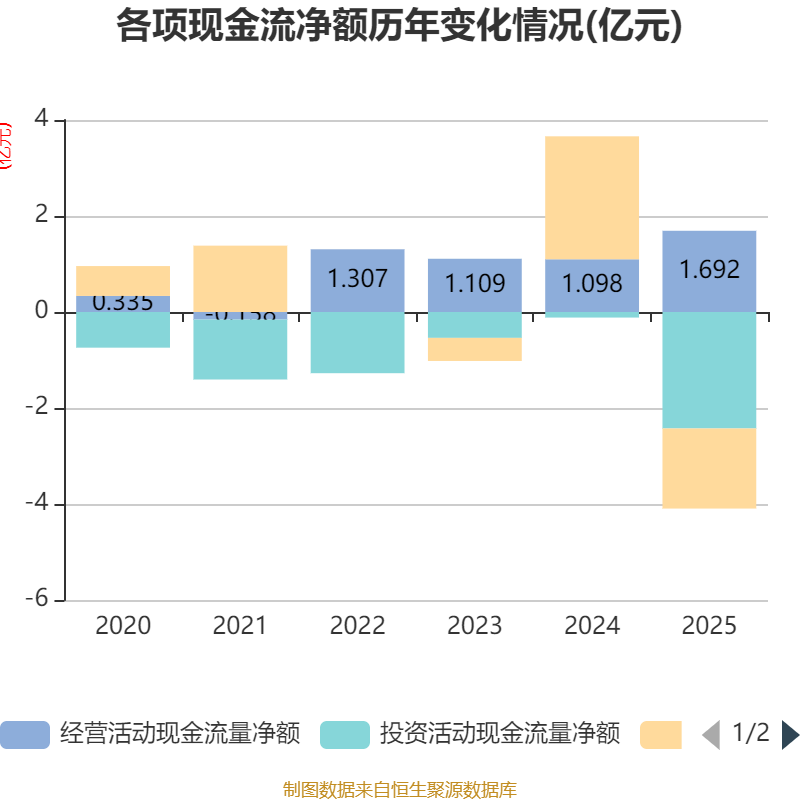 截至2025年,公司经营活动现金流净额为1.69亿元,同比增长54.13%;筹资活动现金流净额-1.67亿元,同比减少4.23亿元;投资活动现金流净额-2.43亿元,上年同期为-1163.92万元。