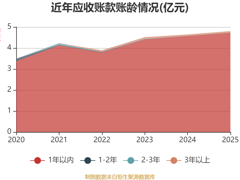 从应收账款账龄结构来看,截至2025年末,公司账龄在1年以内的应收账款余额为4.72亿元,较上年末增长1583.96万元,占应收账款总额比例为98.29%,较上年末上升0.03个百分点。