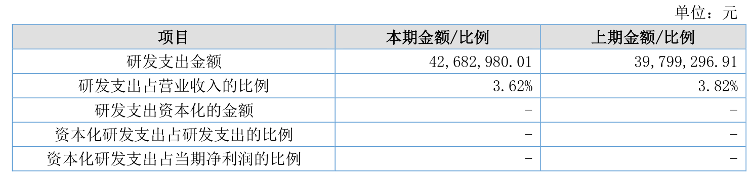 2025年全年,公司研发投入金额为4268.3万元,同比增长7.25%;研发投入占营业收入比例为3.62%,相比上年同期下降0.2个百分点。