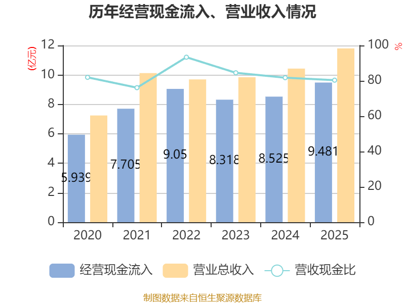 中证智能财讯万源通(920060)3月9日披露2025年年度报告。2025年,公司实现营业总收入11.8亿元,同比增长13.15%;归母净利润1.25亿元,同比增长1.14%;扣非净利润1.18亿元,同比增长1.12%;经营活动产生的现金流量净额为1.69亿元,同比增长54.13%;报告期内,万源通基本每股收益为0.8202元,加权平均净资产收益率为11.93%。公司2025年度分配预案为:拟向全体股东每10股派现5元(含税)。