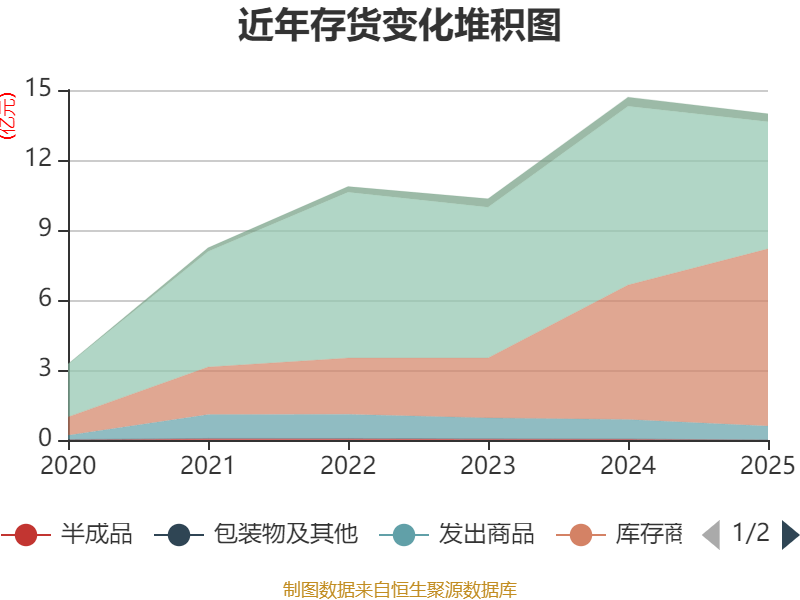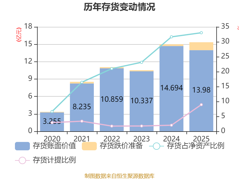 从存货变动来看,截至2025年末,公司存货账面价值为13.98亿元,占净资产的33.03%,较上年末减少7144.52万元。其中,存货跌价准备为1.37亿元,计提比例为8.92%。