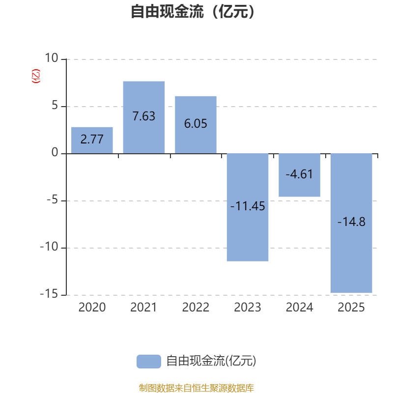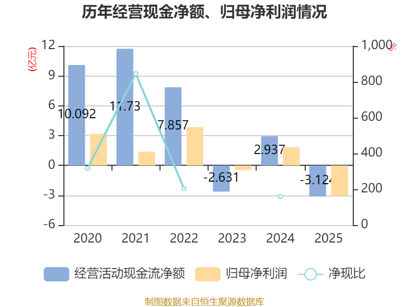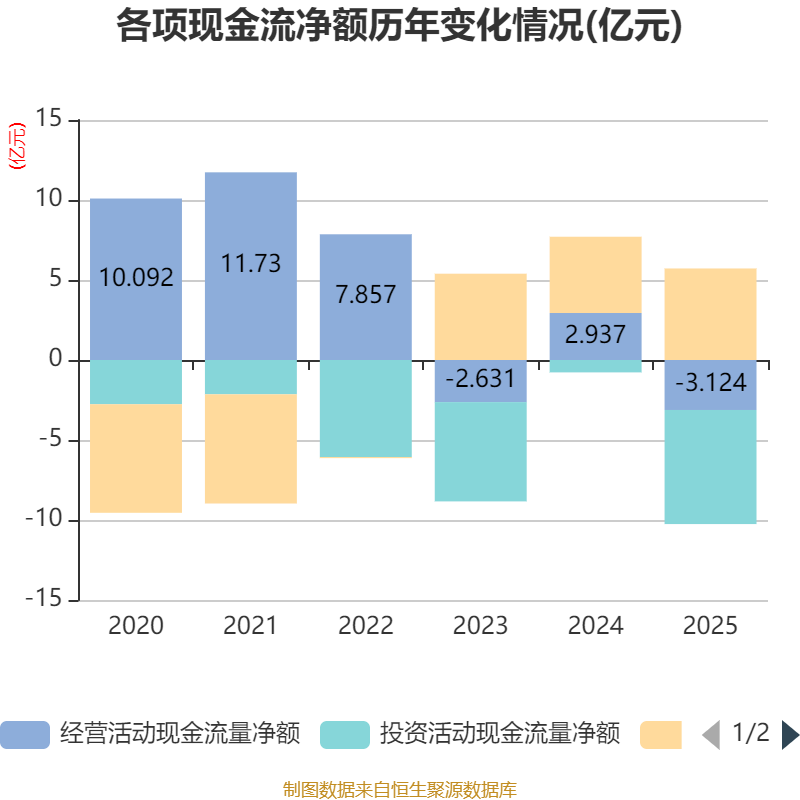 截至2025年,公司经营活动现金流净额为-3.12亿元,同比减少6.06亿元;筹资活动现金流净额5.72亿元,同比增加9534.75万元;投资活动现金流净额-7.13亿元,上年同期为-7743.15万元。