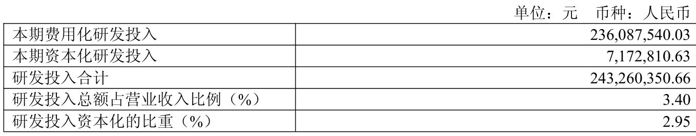 2025年全年,公司研发投入金额为2.43亿元,同比下降33.46%;研发投入占营业收入比例为3.4%,相比上年同期下降1.42个百分点。此外,公司全年研发投入资本化率为2.95%。