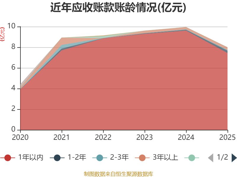 从应收账款账龄结构来看,截至2025年末,公司账龄在1年以内的应收账款余额为7.44亿元,较上年末下降2.17亿元,占应收账款总额比例为93.19%,较上年末下降3.45个百分点。