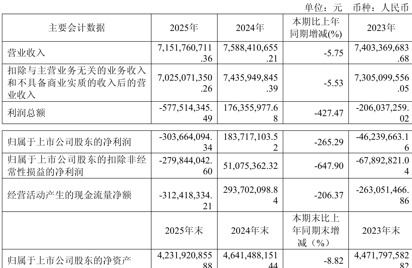 中证智能财讯冠豪高新(600433)3月11日披露2025年年度报告。2025年,公司实现营业总收入71.52亿元,同比下降5.75%;归母净利润亏损3.04亿元,上年同期盈利1.84亿元;扣非净利润亏损2.8亿元,上年同期盈利5107.54万元;经营活动产生的现金流量净额为-3.12亿元,上年同期为2.94亿元;报告期内,冠豪高新基本每股收益为-0.17元,加权平均净资产收益率为-6.86%。