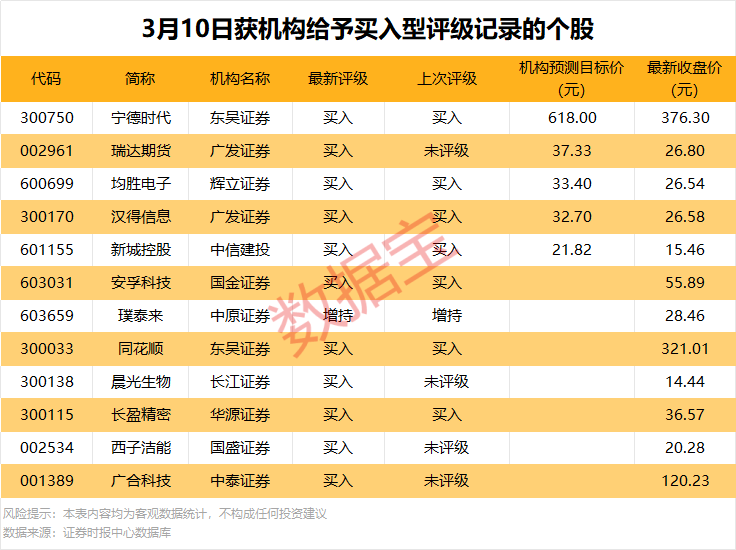 今日获机构买入型评级个股中,共有5条评级记录中对相关个股给出了预测目标价。以公布的预测目标价与最新收盘价进行对比显示,5股上涨空间均超20%,宁德时代上涨空间最高,3月10日东吴证券预计公司目标价为618元/股,上涨空间达64.23%;上涨空间较高的个股还有新城控股、瑞达期货等,上涨空间分别为41.14%、39.29%。