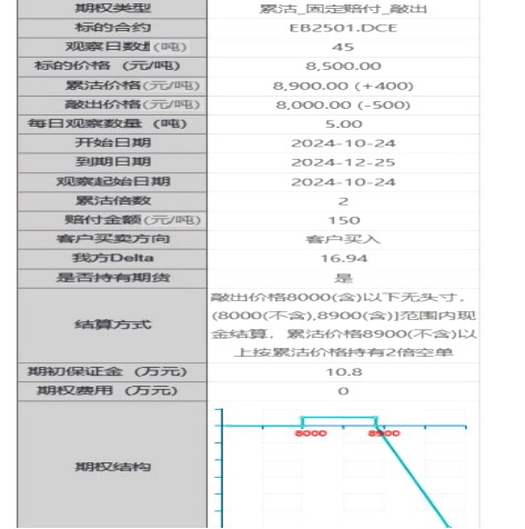 2024年8月开始,受美国需求因素影响,亚洲和美洲的套利窗口始终未打开,进而导致大批量亚洲纯苯进入我国市场,国内进口量达到历史高位,纯苯价格不断走弱。供应端,炼厂利润扩张至年内高位,苯乙烯产量处于近5年同期高位,仅低于2023年。需求端,2024年11月苯乙烯需求就要进入淡季。下游3S利润虽处于高位,但整体开工率偏低,EPS即将进入季节性淡季,ABS开工率预期持稳,PS开工率预计小幅提升,苯乙烯整体需求量不会出现大幅增长。此外,贸易商面临着期货价格预期升水现货的情况,即期货价格高于现货价格。在这种市场预期下,进行期货套期保值操作时,基差仍为正,但安全边际较小,风险相对较高。因此,为了有效管理价格风险,降低市场波动对企业经营的影响,我们推荐企业使用固收累沽期权策略。该策略接到空单可以锁定利润,同时通过累积卖出期权获取权利金收益。