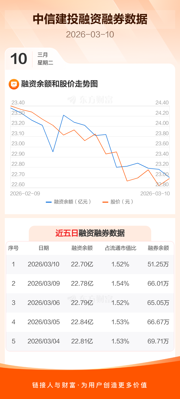 交易所最新数据显示,中信建投于2026年3月10日获融资买入1748.95万元,融资偿还2509.57万元,当日融资净偿还760.61万元。目前,该股融资余额22.70亿,占流通市值比例为1.52%。