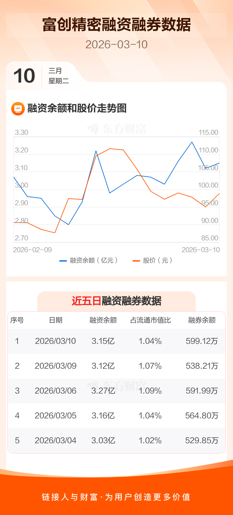 交易所最新数据显示,富创精密于2026年3月10日获融资买入5441.52万元,融资偿还5151.69万元,当日融资净买入289.83万元。目前,该股融资余额3.15亿,占流通市值比例为1.04%。