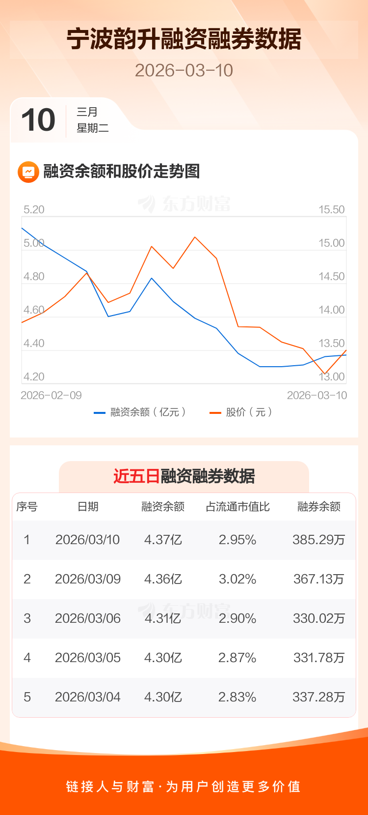 交易所最新数据显示,宁波韵升于2026年3月10日获融资买入2611.62万元,融资偿还2469.55万元,当日融资净买入142.06万元。目前,该股融资余额4.37亿,占流通市值比例为2.95%。