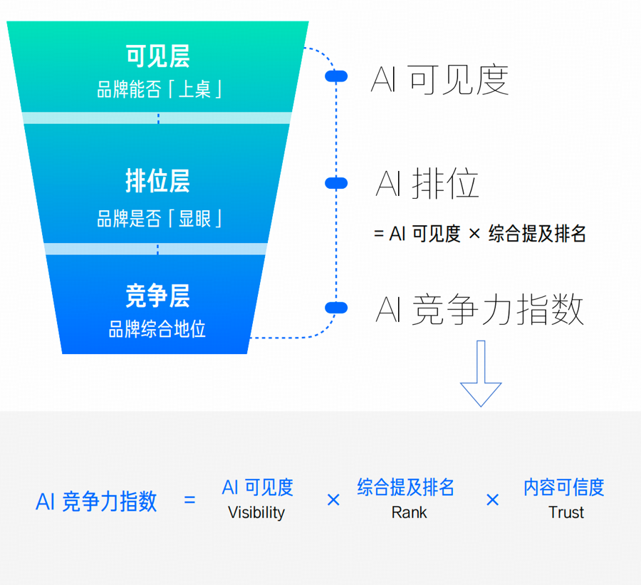 为此,知乎联合中国信息通信研究院人工智能研究所发布《2026品牌AI竞争力报告》,首次提出“品牌AI竞争力指数=AI可见度×综合提及排名×内容可信度”的公式,将AI推荐的黑盒机制转化为可监测的核心指标。知乎营销研究院负责人桑田在现场发言中表示:“在品牌AI竞争力的三层递进框架中,可见层意味着品牌能否上桌,排位层决定品牌是否显眼,而竞争层则反映了品牌的综合地位。”