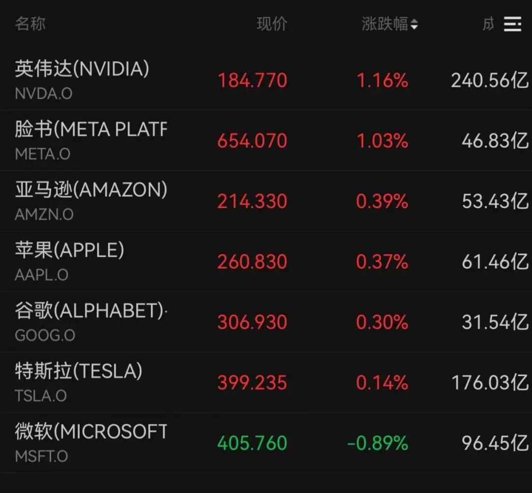 美股科技“七巨头”中,微软下跌0.89%,英伟达、脸书涨超1%,亚马逊、苹果、谷歌、特斯拉均收涨。