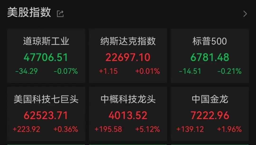 美股三大指数涨跌不一,标普500指数下跌0.21%,道琼斯工业指数下跌0.07%,纳斯达克指数上涨0.01%。
