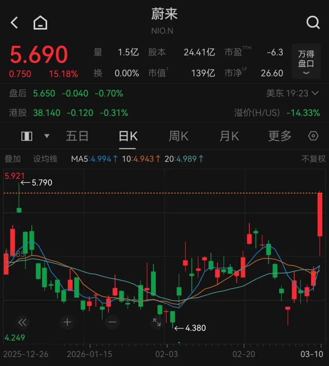 蔚来大涨超15%