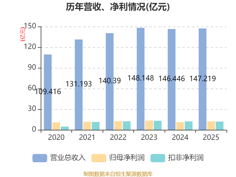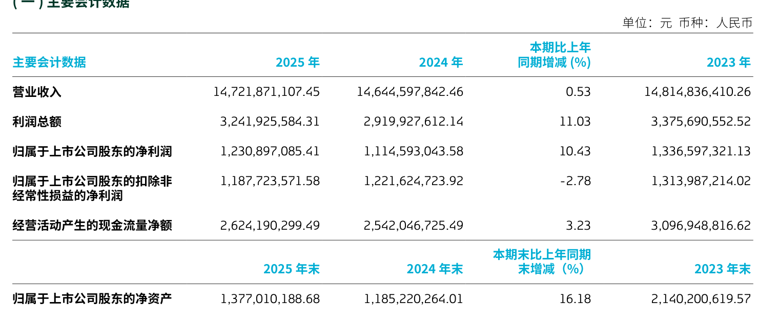 中证智能财讯重庆啤酒(600132)3月11日披露2025年年度报告。2025年,公司实现营业总收入147.22亿元,同比增长0.53%;归母净利润12.31亿元,同比增长10.43%;扣非净利润11.88亿元,同比下降2.78%;经营活动产生的现金流量净额为26.24亿元,同比增长3.23%;报告期内,重庆啤酒基本每股收益为2.54元,加权平均净资产收益率为81.68%。公司2025年度分配预案为:拟向全体股东每10股派现12元(含税)。