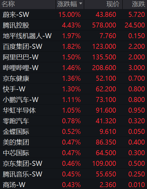 科网股普涨,腾讯控股涨逾4%,百度集团、阿里巴巴、哔哩哔哩、京东健康、快手等涨超1%。