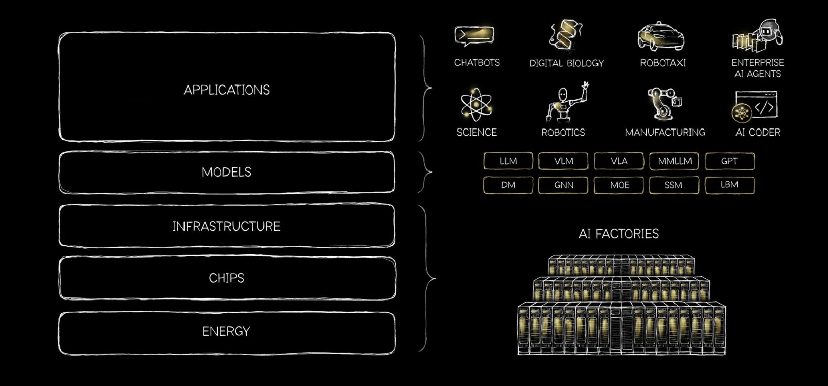 为了厘清AI产业的底层结构,黄仁勋系统定义了AI“五层架构”,将其形象地比喻为“五层蛋糕”,自下而上依次由能源、芯片、基础设施、模型和应用构成,每一层相互支撑、相互拉动,任何成功的上层应用,都必须完全依赖底层设施乃至发电厂的持续支撑。