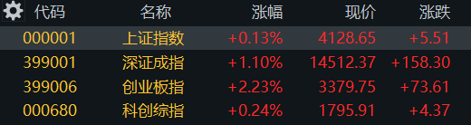 【大河财立方消息】3月11日,A股持续走高,创业板指盘中涨幅扩大至2%,截至发稿涨2.23%,沪指涨0.13%,深成指涨1.10%,科创综指涨0.24%。沪深京三市上涨个股近2300只。