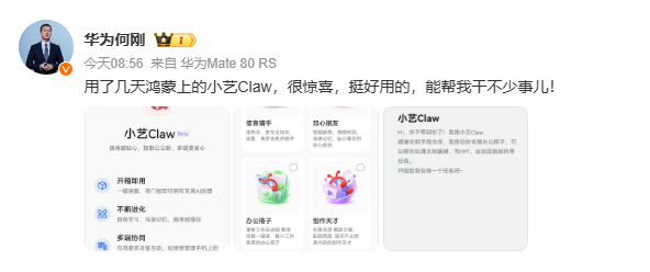【大河财立方消息】3月11日,华为终端BG首席执行官@华为何刚发文晒小艺Claw,并透露自己用了几天,很惊喜,挺好用的,能帮我干不少事儿!